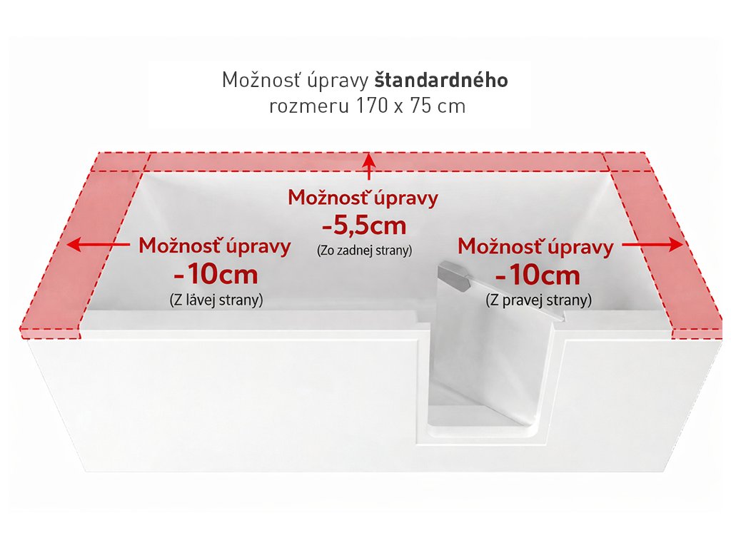Potrebujete upraviť dĺžku vane? Bez straty záruky je možné rezať ľavý aj pravý okraj, a to každý až o 10 cm, čím dosiahnete minimálnu dĺžku 150 cm.